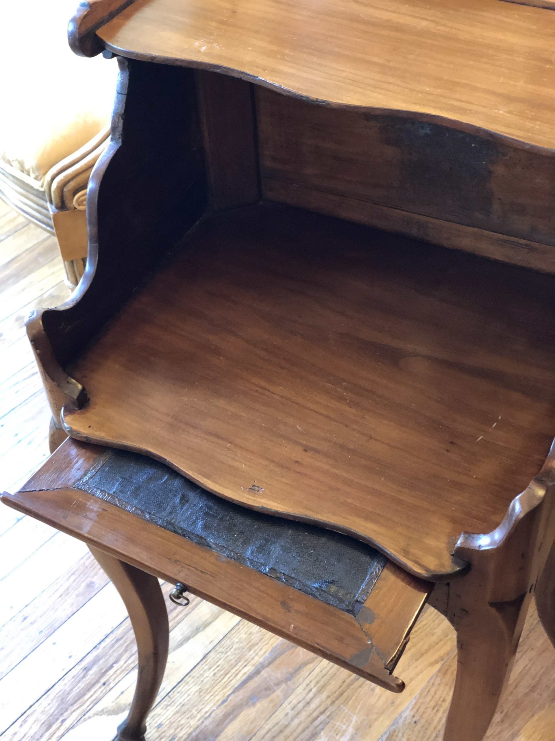 French 18thC Cherry Side Table April 10, 2020December 11, 2021 in Furniture, Tables Cabriole legs and hoof feet, Pull out slide, Curved sides, Two tier