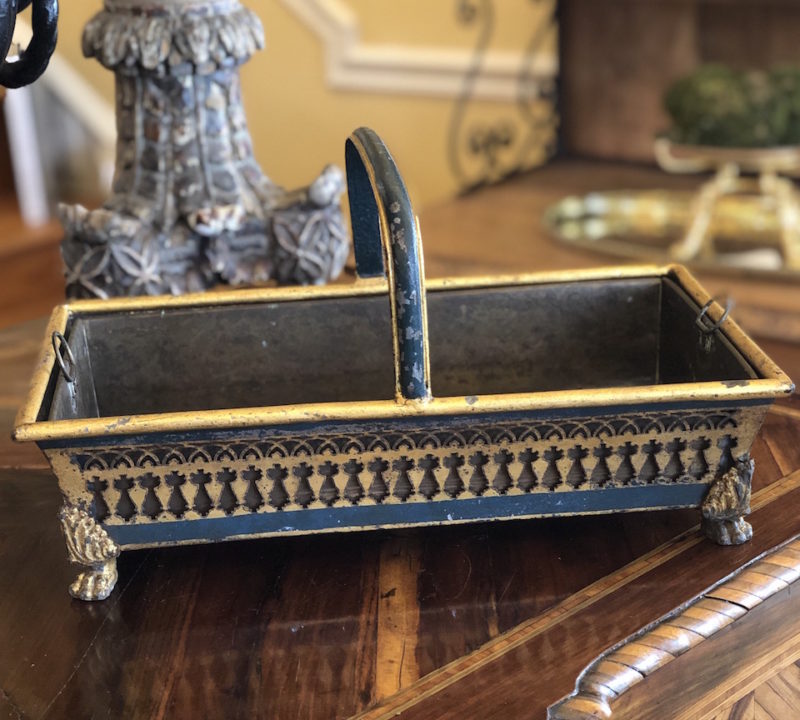 French 19thc Tole Basket April 30, 2020December 11, 2021 in Objects French tole basket with handle. Pierced open work design with paw feet. Original insert.